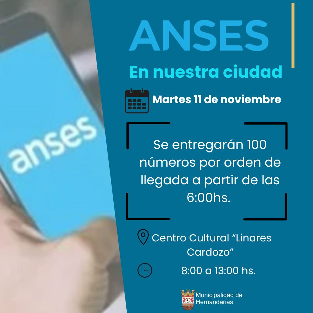 La Administración Nacional de la Seguridad Social (ANSES) brindará atención en nuestra localidad el martes 11 de noviembre.